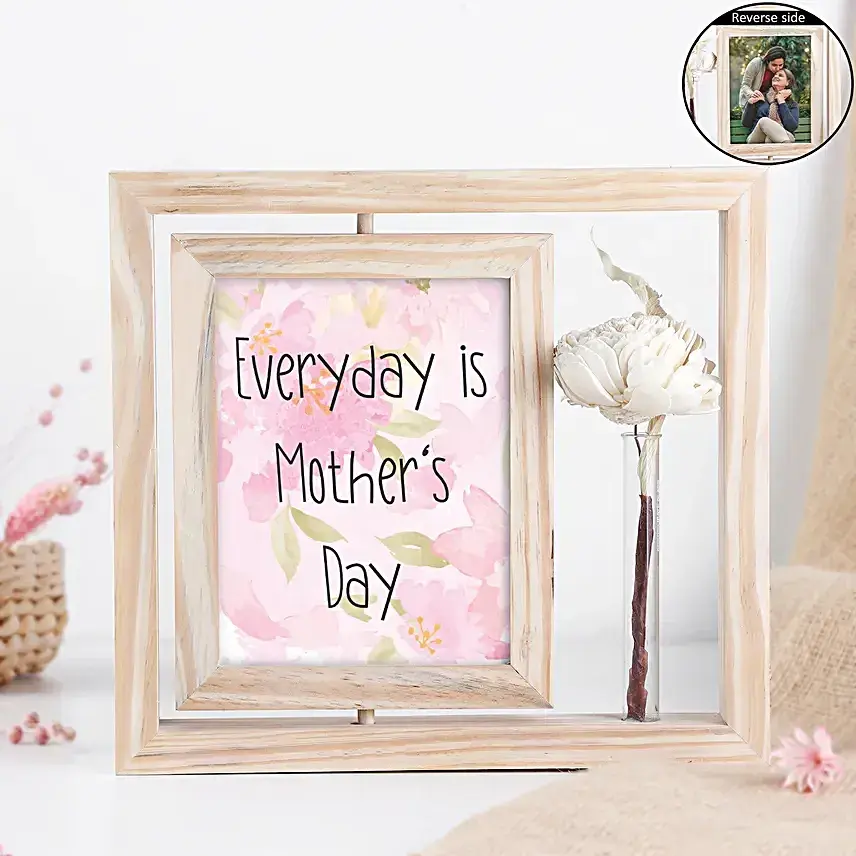 Celebrate Moms unconditional love with our personalised rotating photo frame. Engraved with Every day is Mothers Day on one side and customisable with her cherished memories on the other, its a constant reminder of her importance. Enhanced by a delicate dry flower, it adds to its aesthetic appeal. This unique gift honours her year-round, making every moment special.